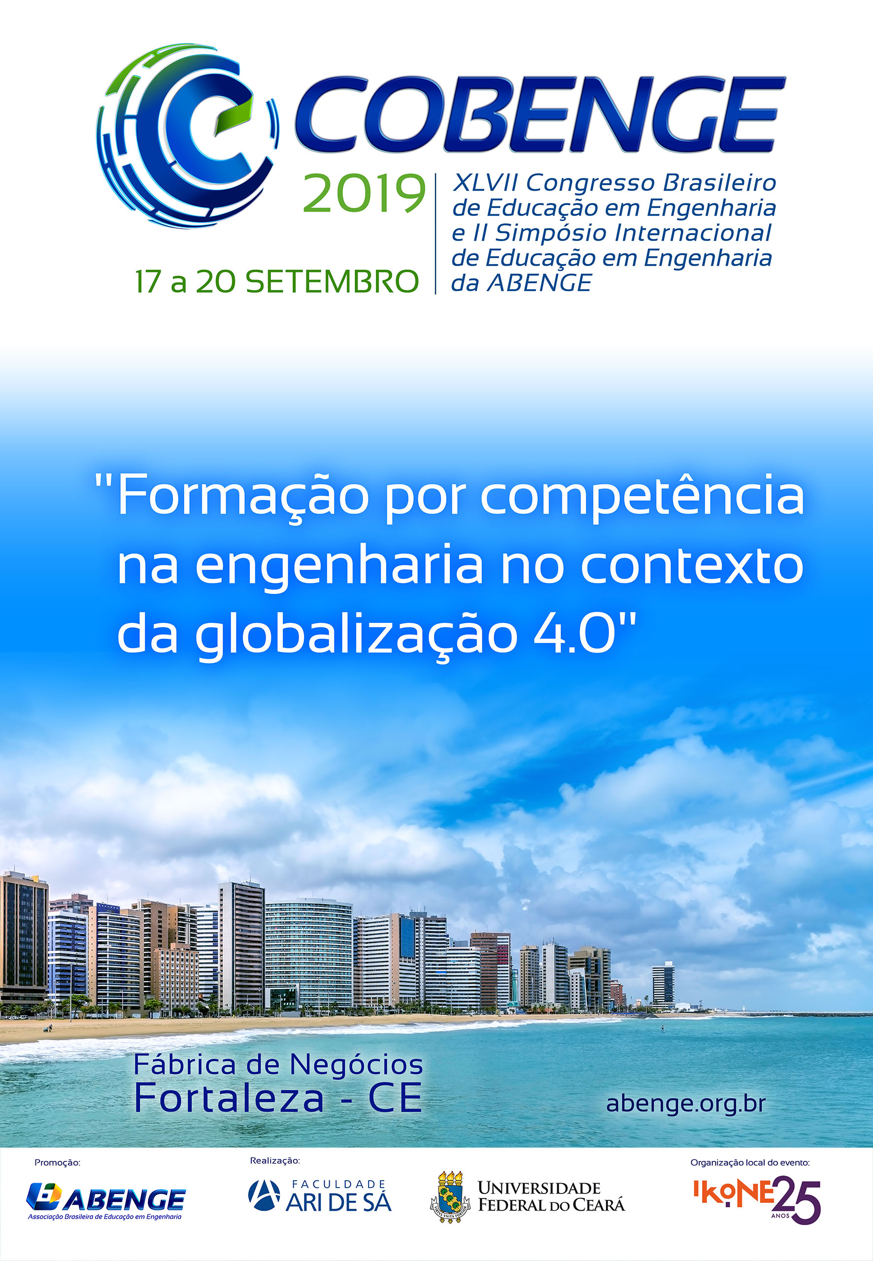 A Associação Brasileira de Educação em Engenharia (ABENGE) e as Instituições Faculdade Ari de Sá e Universidade Federal do Ceará convidam a todos para estarem juntos em Fortaleza, no período de 17 a 20 de setembro de 2019, no XLVII Congresso Brasileiro de Educação em Engenharia (COBENGE) e 2º Simpósio Internacional de Educação em Engenharia da ABENGE. Esse evento acontece anualmente e tem como foco a educação em engenharia.